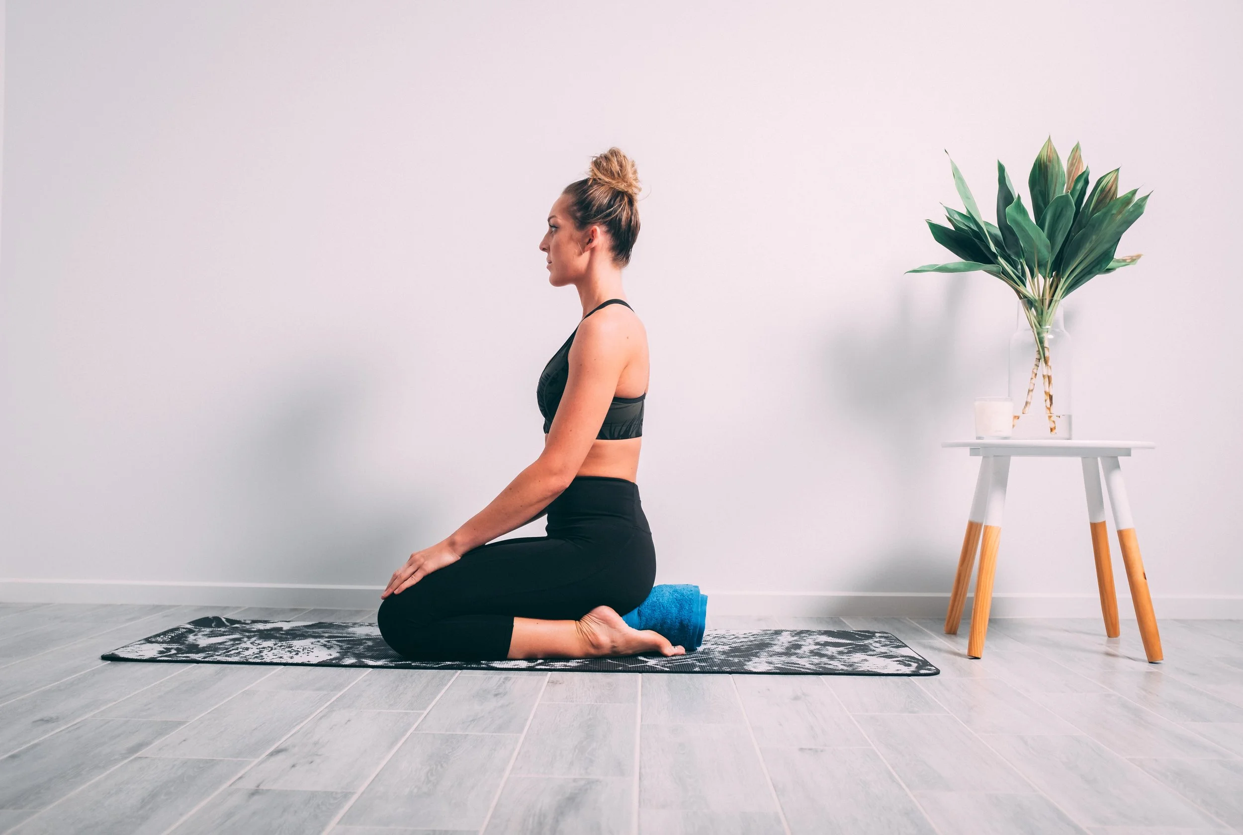 Start in a sitting position on a chair or the floor. Your legs can be crossed or you can be kneeling. Place a small rolled up towel in between your legs so you feel a gentle pressure on your perineum (the space between vagina and anus!)